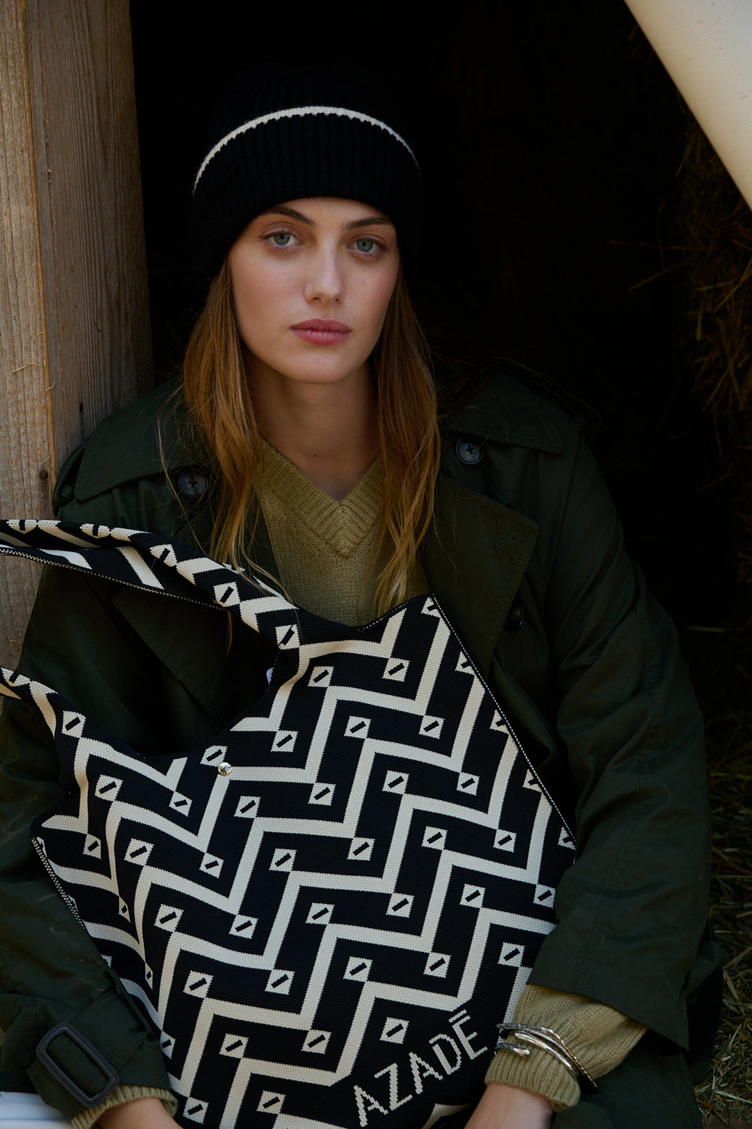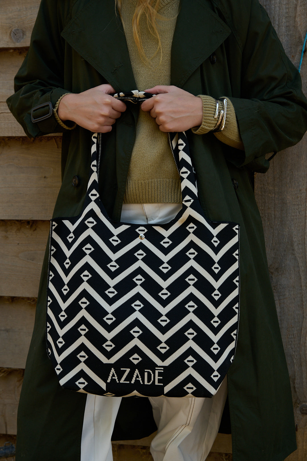 Azadé Υφασμάτινη Τσάντα Ώμου με Μαύρο-Λευκό Γεωμετρικό Σχέδιο
