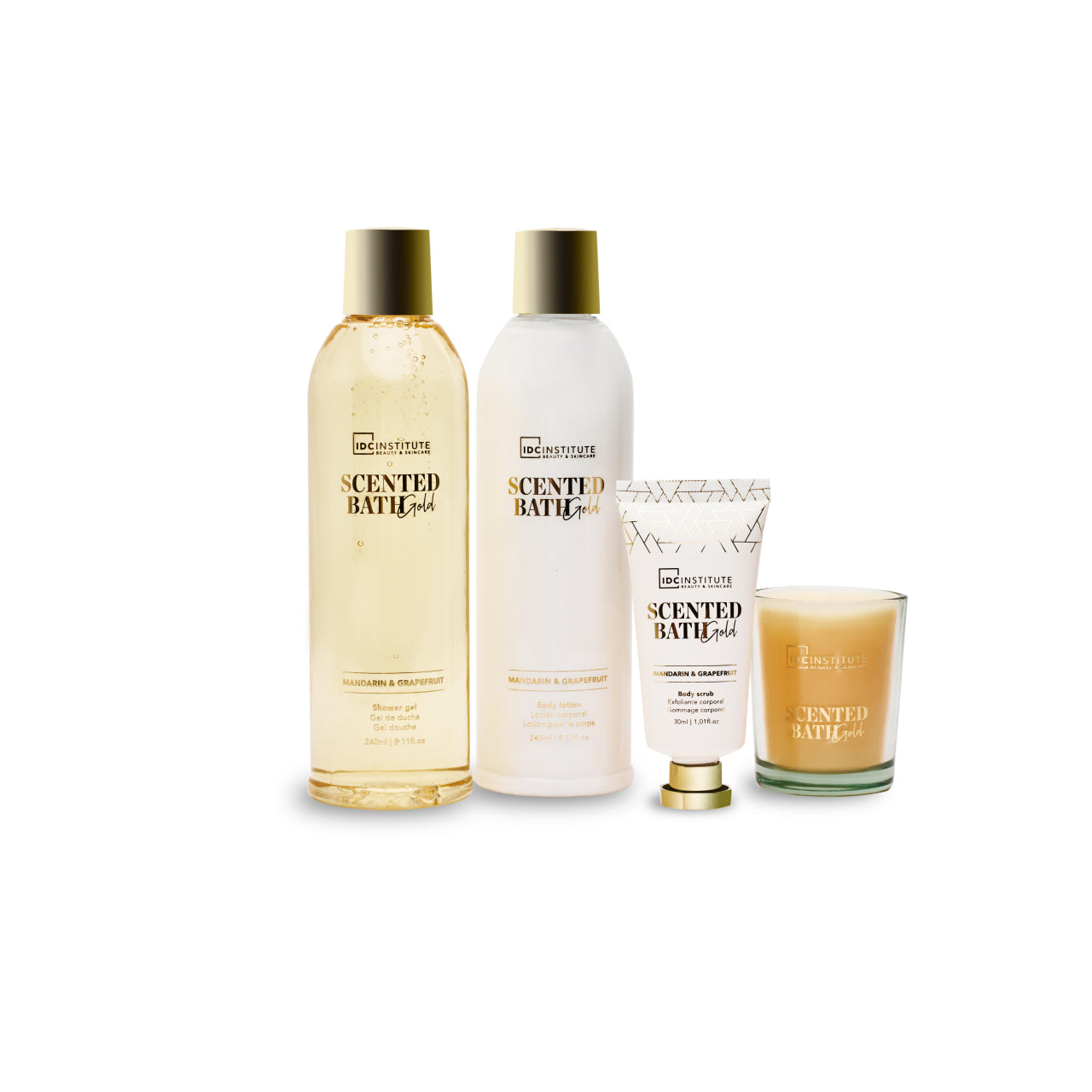 IDC Institute Gift set with 4 care products Scented Bath 240ml shower gel 240ml body lotion 30ml body scrub 50g candle