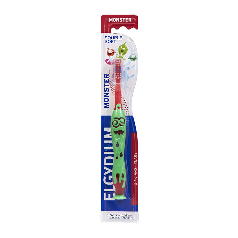 Elgydium Οδοντόβουρτσα Kids Monster (2-6 yrs) 1pc Μωβ-Πράσινο, Ροζ-Κόκκινο, Πράσινο-Κίτρινο & Πορτοκαλί-Μπλε
