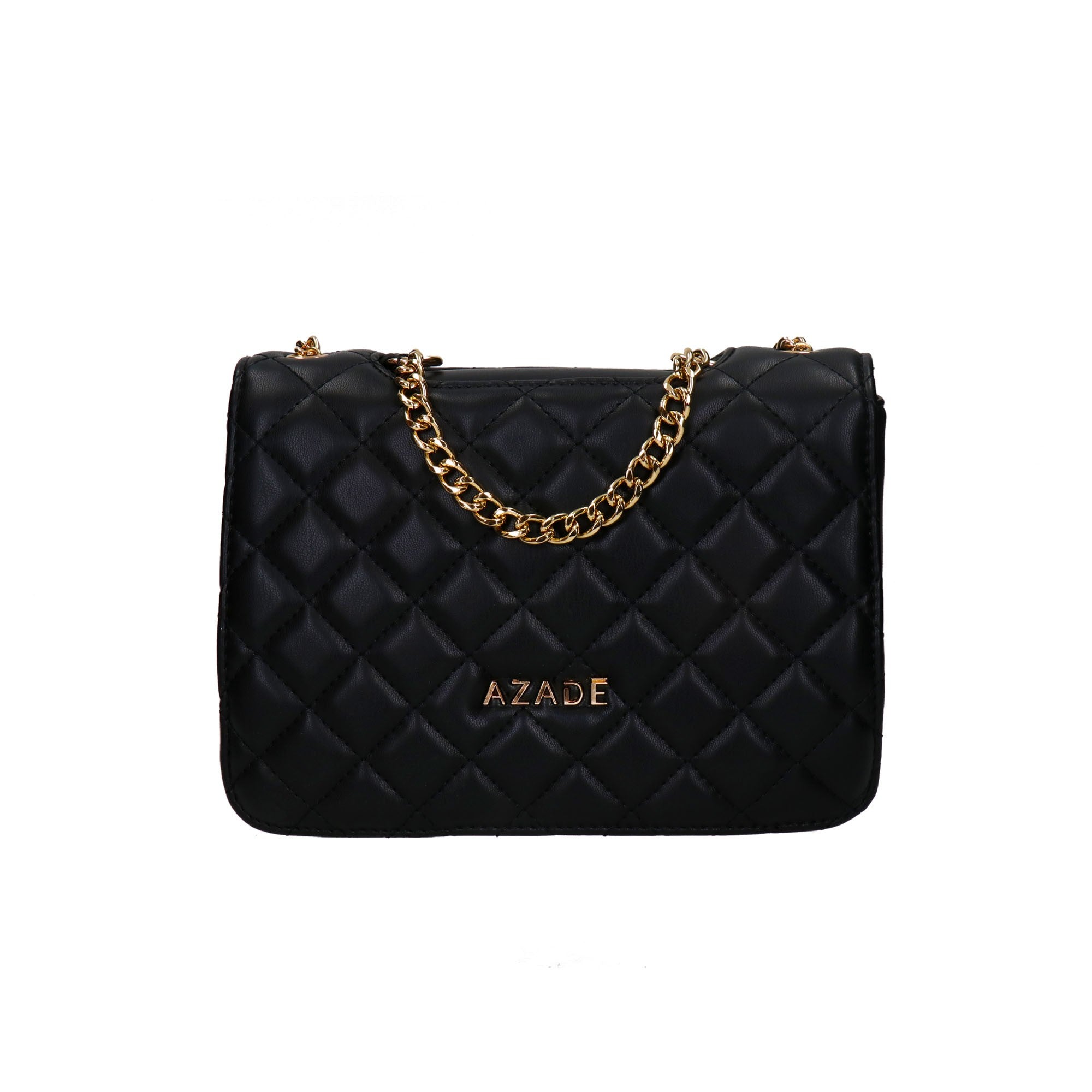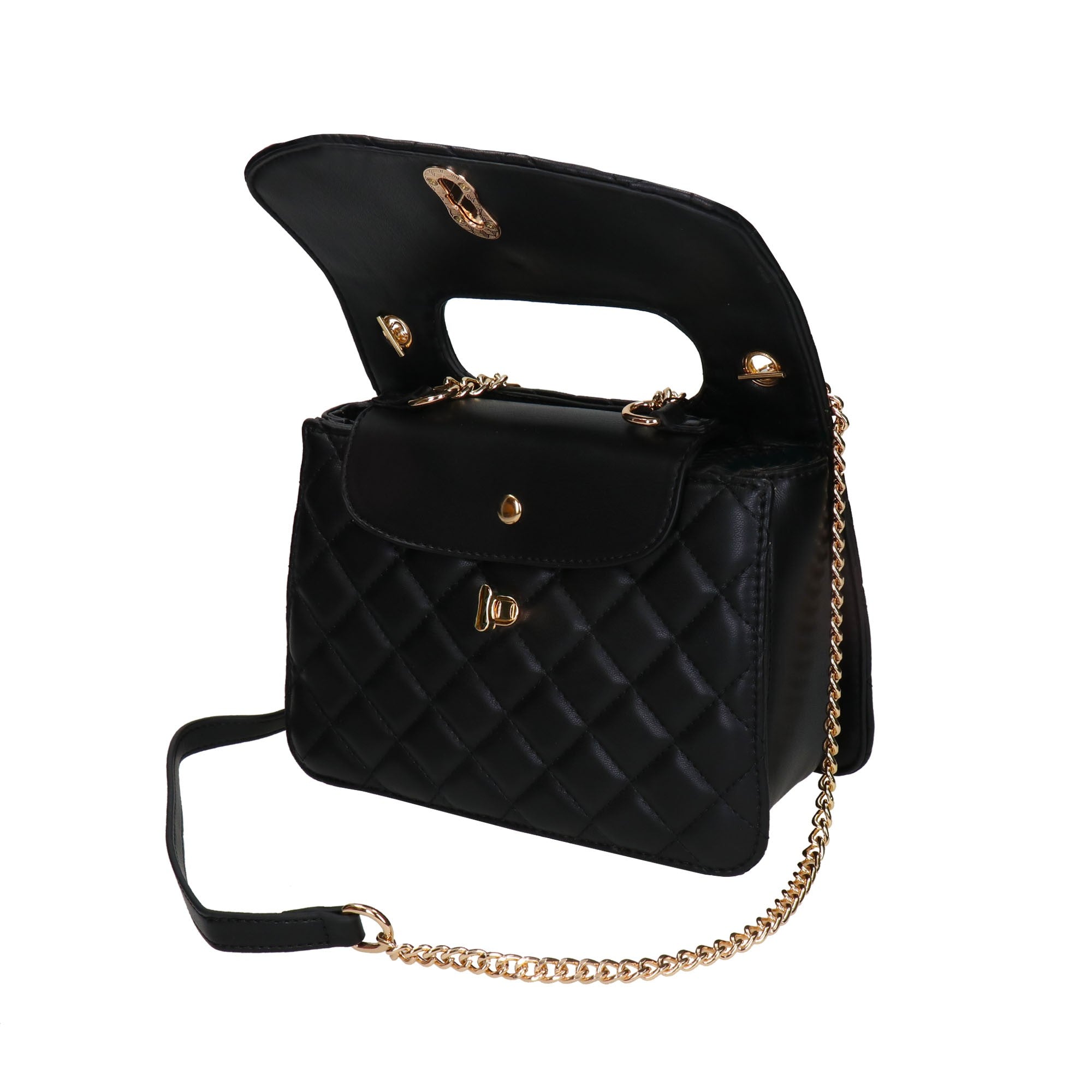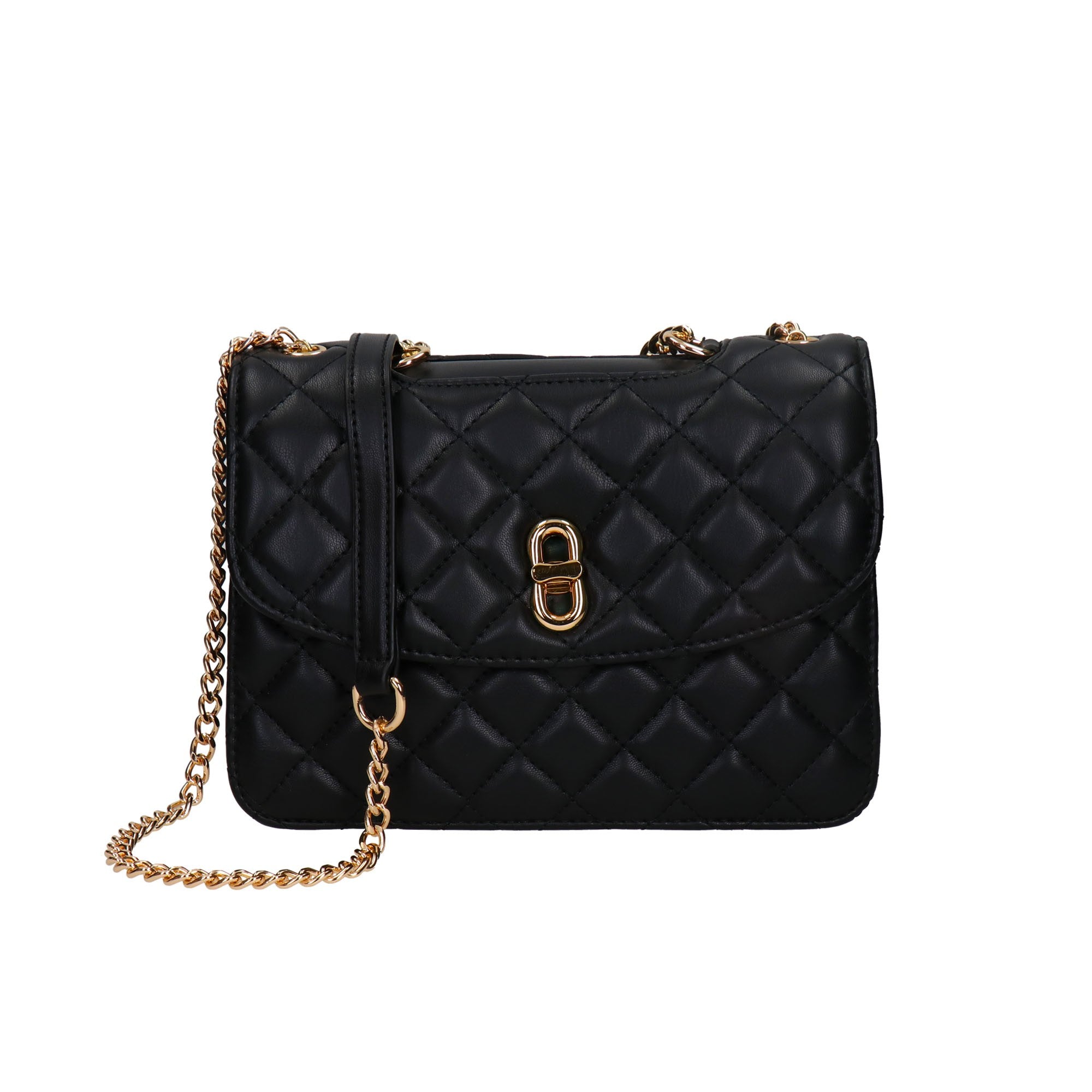 Τσάντα ώμου μαύρη, με καπιτονέ συνθετικό δέρμα. Κλείσιμο με μεταλλικό turn-lock κούμπωμα .Εσωτερικά ενιαίος χώρος με υφασμάτινη επένδυση με logo και τσέπη που κλείνει με φερμουάρ και επιπλέον ανοιχτή τσέπη. Διαθέτει λαβή μονής αλυσίδας αλλά συνοδεύεται και από αποσπώμενο ρυθμιζόμενο λουράκι. Με προστατευτική θήκη.