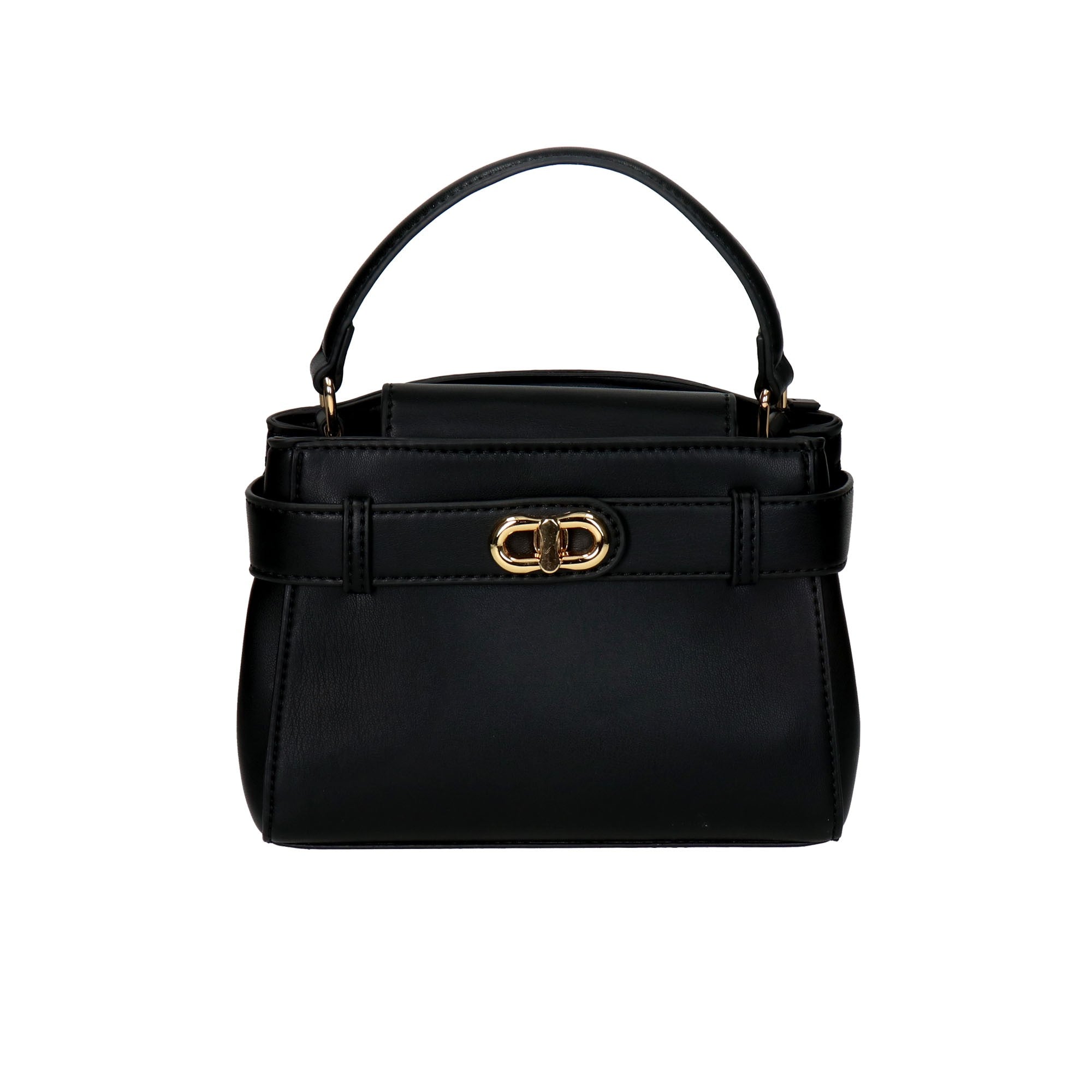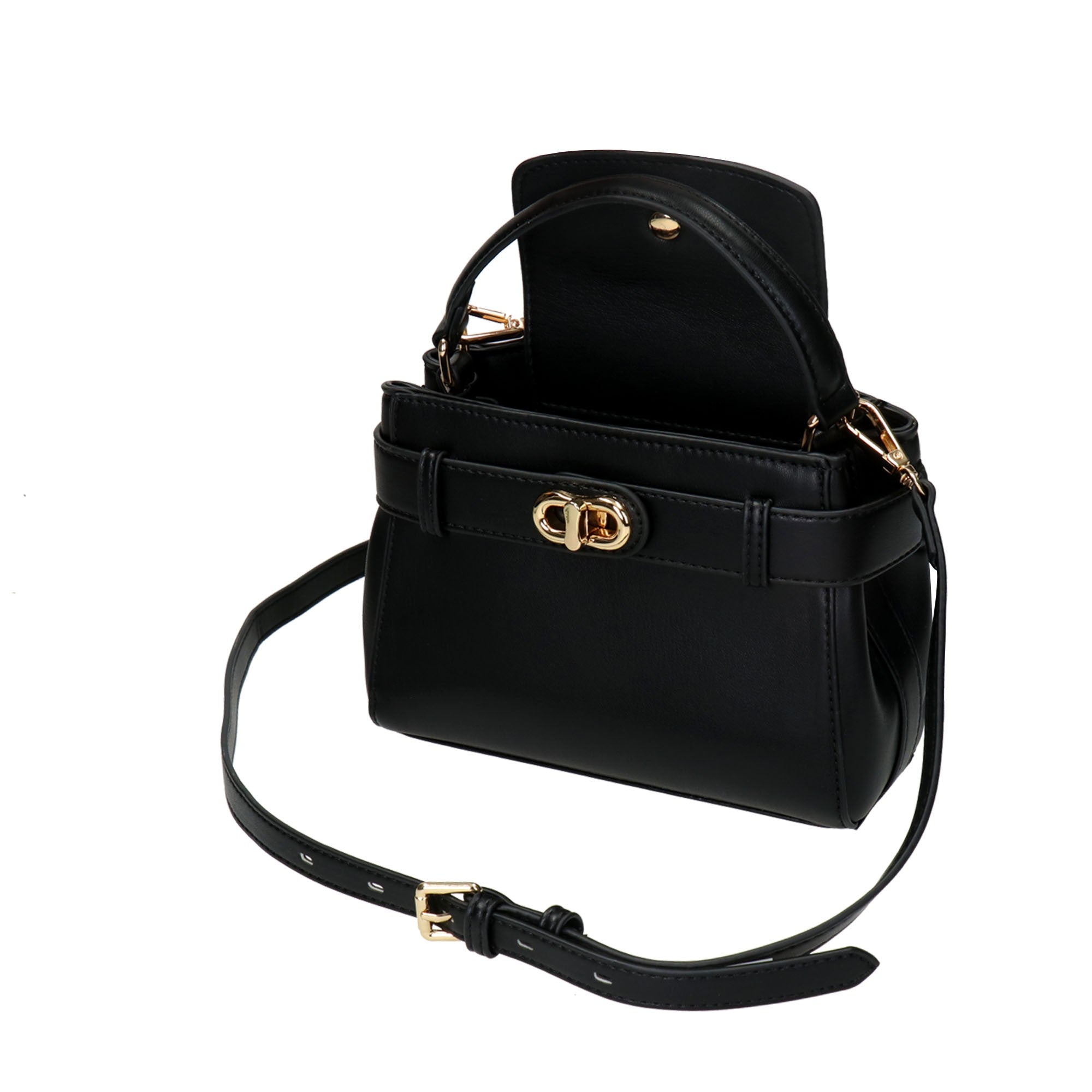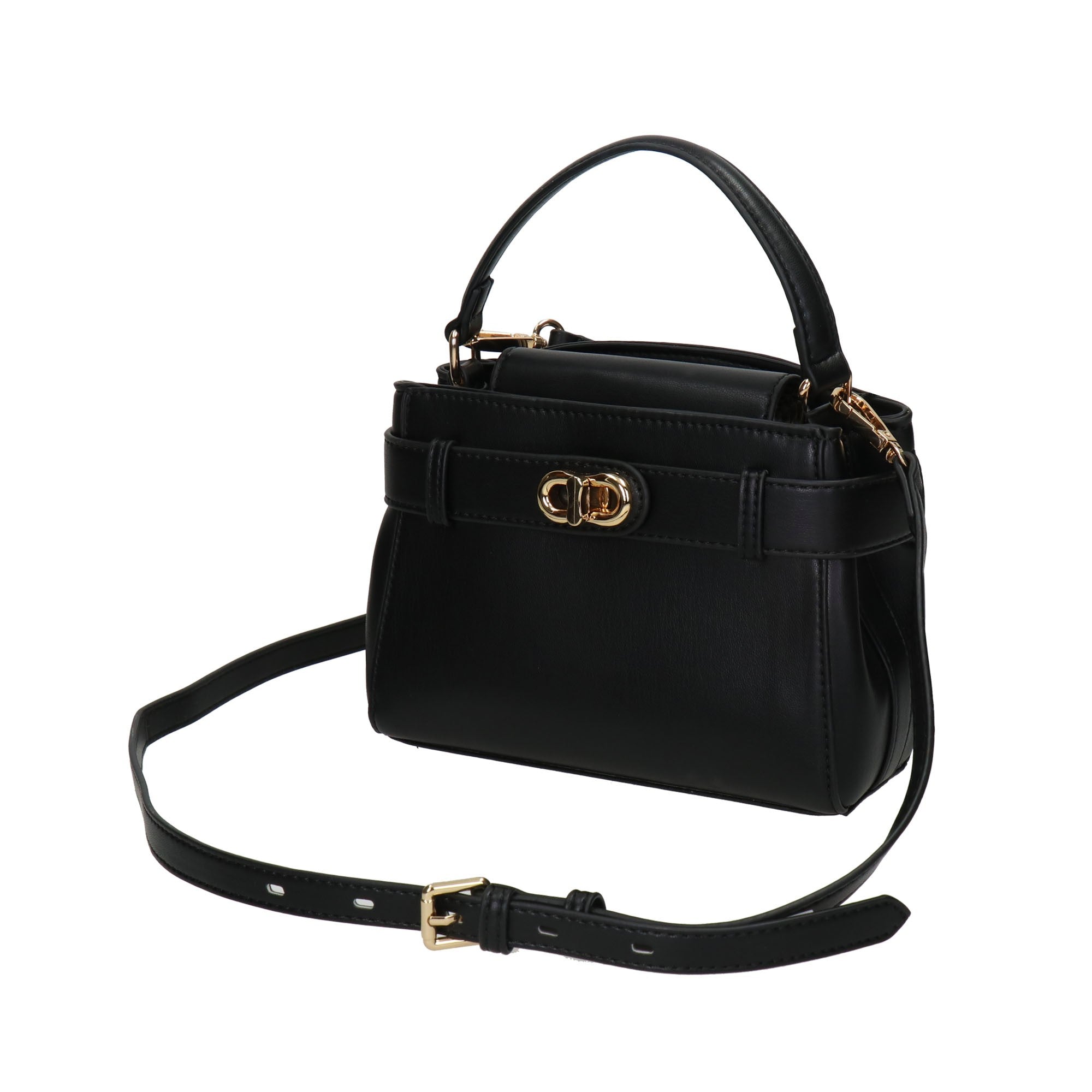 Τσάντα μινι top handle μαύρη, από μαλακό συνθετικό δέρμα. Κομψό σχέδιο με ζώνη και επιχρυσωμένο μεταλλικό κούμπωμα .Ευρύχωρο εσωτερικό με ενιαίο χώρο, με υφασμάτινη επένδυση με logo και τσέπη που κλείνει με φερμουάρ και επιπλέον ανοιχτή τσέπη. Συνοδεύεται από αποσπώμενο λουράκι για να φορεθεί και χιαστί. Με προστατευτική θήκη.