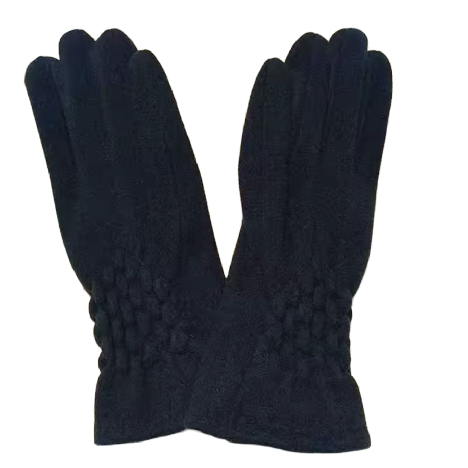 Κομψά γυναικεία γάντια σε μαύρο χρώμα με διακοσμητική πλέξη στο πάνω μέρος. Κατασκευασμένα από μαλακό και ζεστό ύφασμα, προσφέρουν άνεση και στυλ στις χειμερινές σας εμφανίσεις. Κατάλληλα για καθημερινή χρήση.