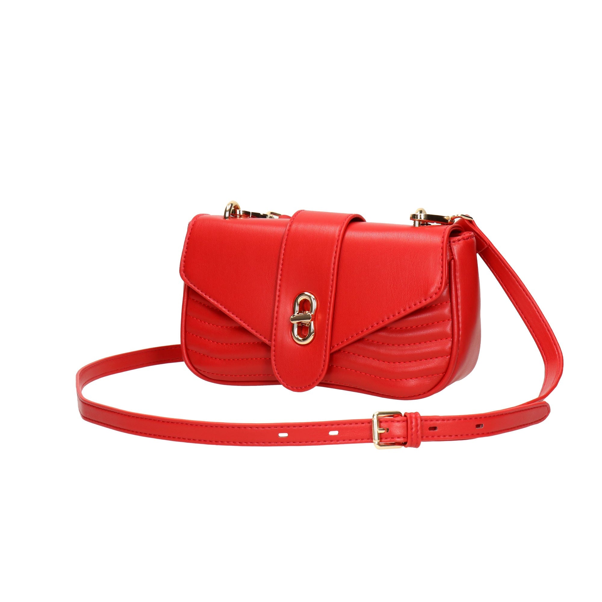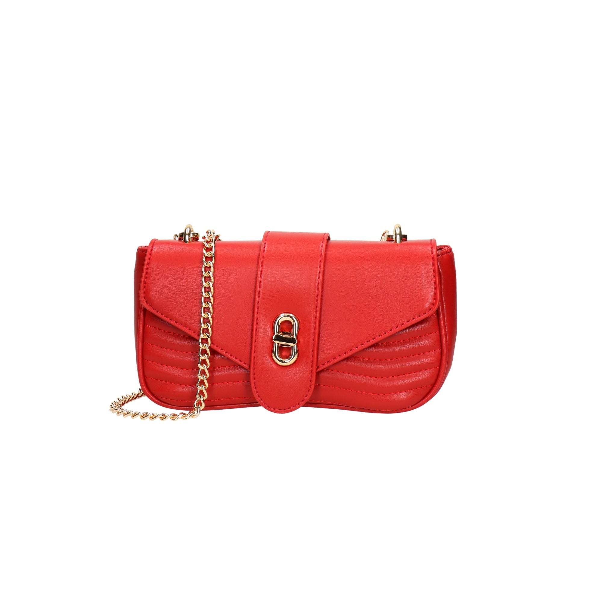 Crossbody panelled bag in red, made of soft vegan leather and turn-lock closure.The interior has fabric embroidered lining and a zipped pocket with additional open pocket.Comes with one chained strap and one leather strap With a protective case.