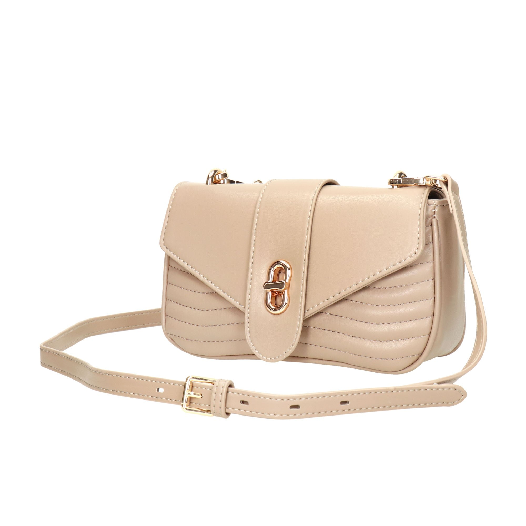 Crossbody panelled bag in taupe, made of soft vegan leather and turn-lock closure.The interior has fabric embroidered lining and a zipped pocket with additional open pocket.Comes with one chained strap and one leather strap With a protective case.