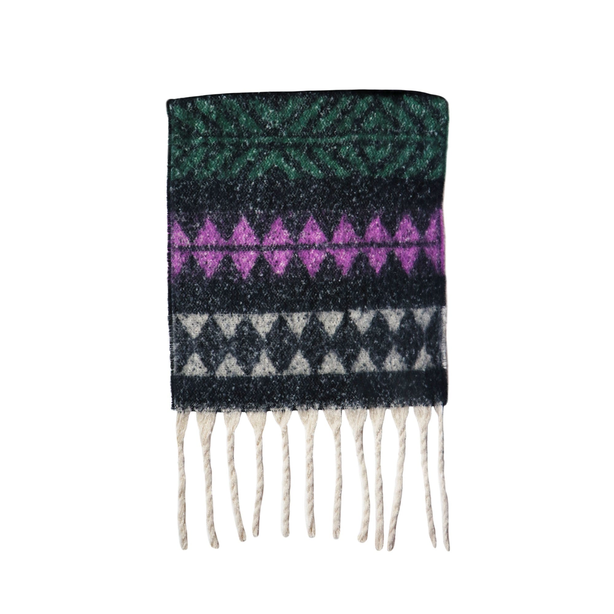 Φουλάρι χοντρό μαύρο και μωβ-πράσινα σχέδια με κρόσσια στις άκρες. Mε υπέροχη απαλή υφή.