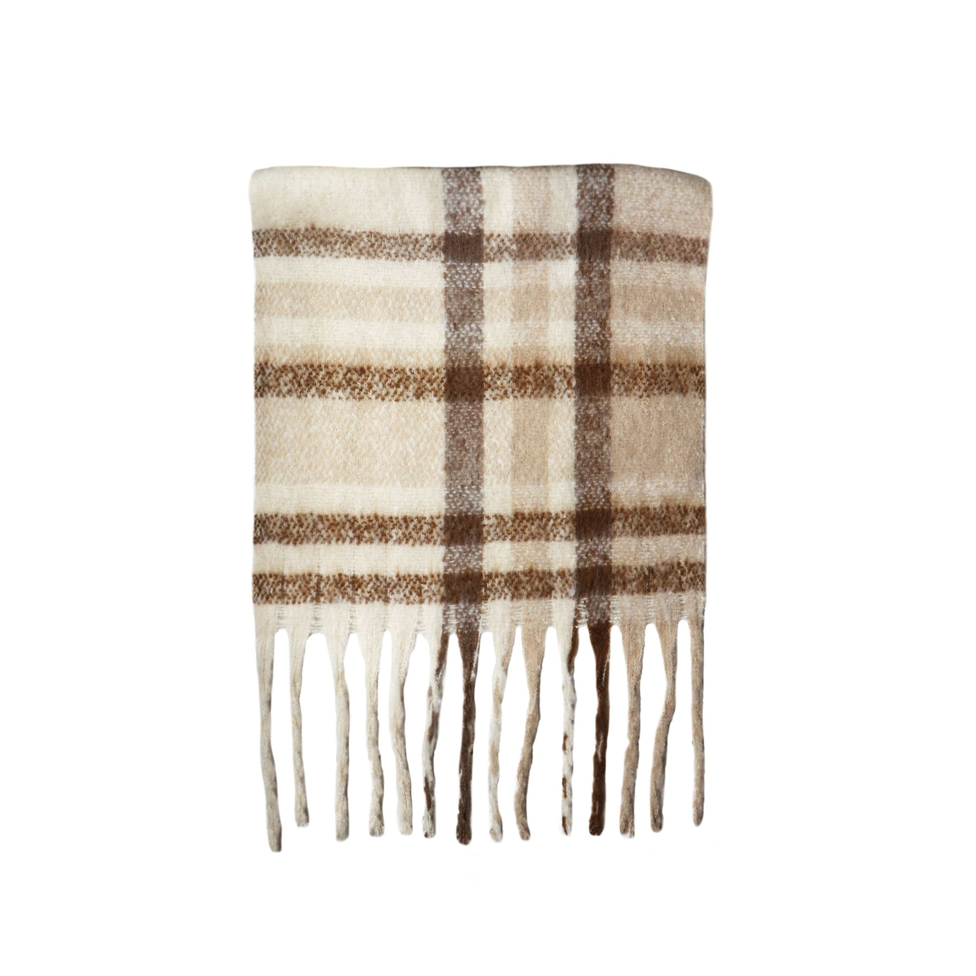 Φουλάρι δίχρωμο σε αποχρώσεις μπέζ-καφέ με κρόσσια στις άκρες. Mε υπέροχη απαλή υφή.