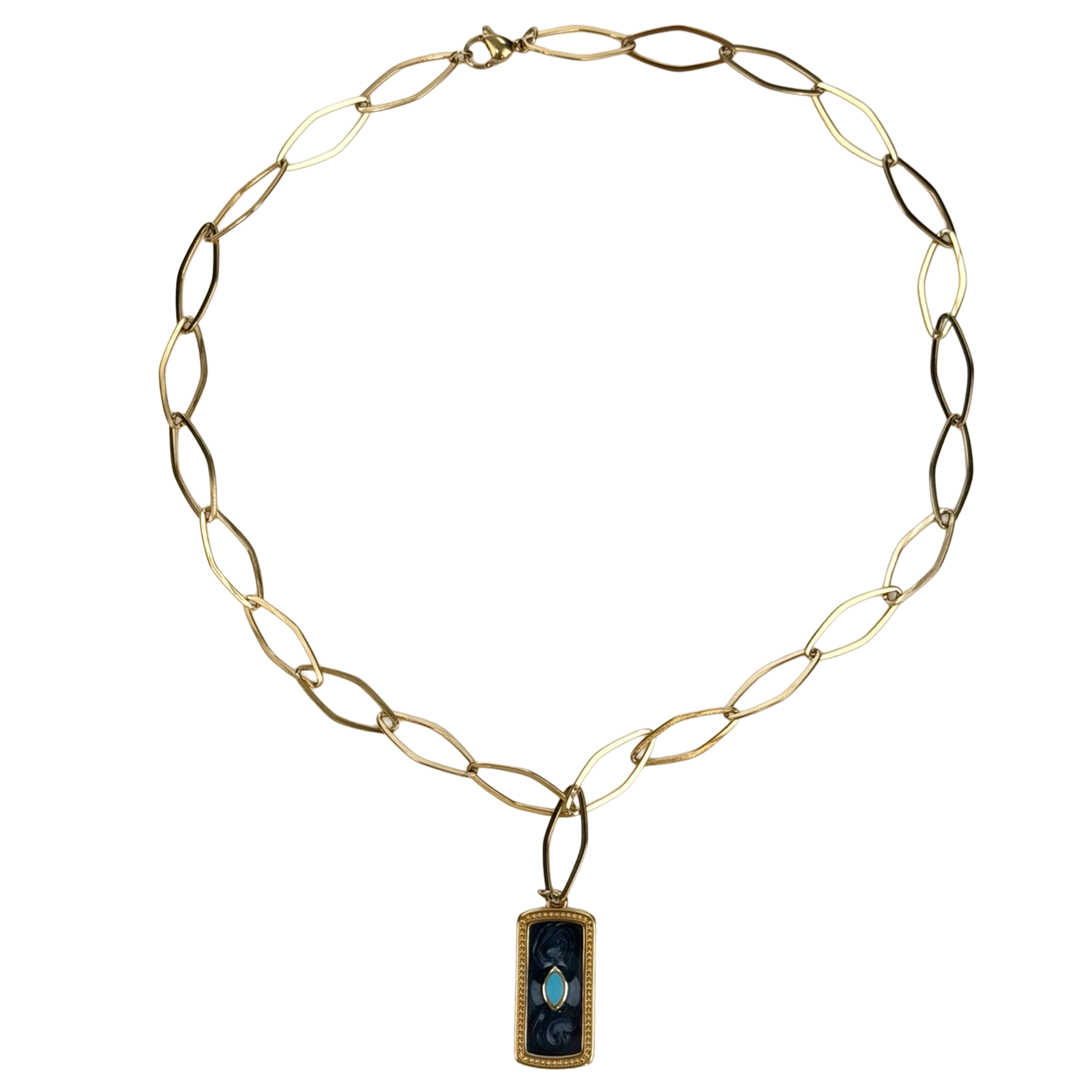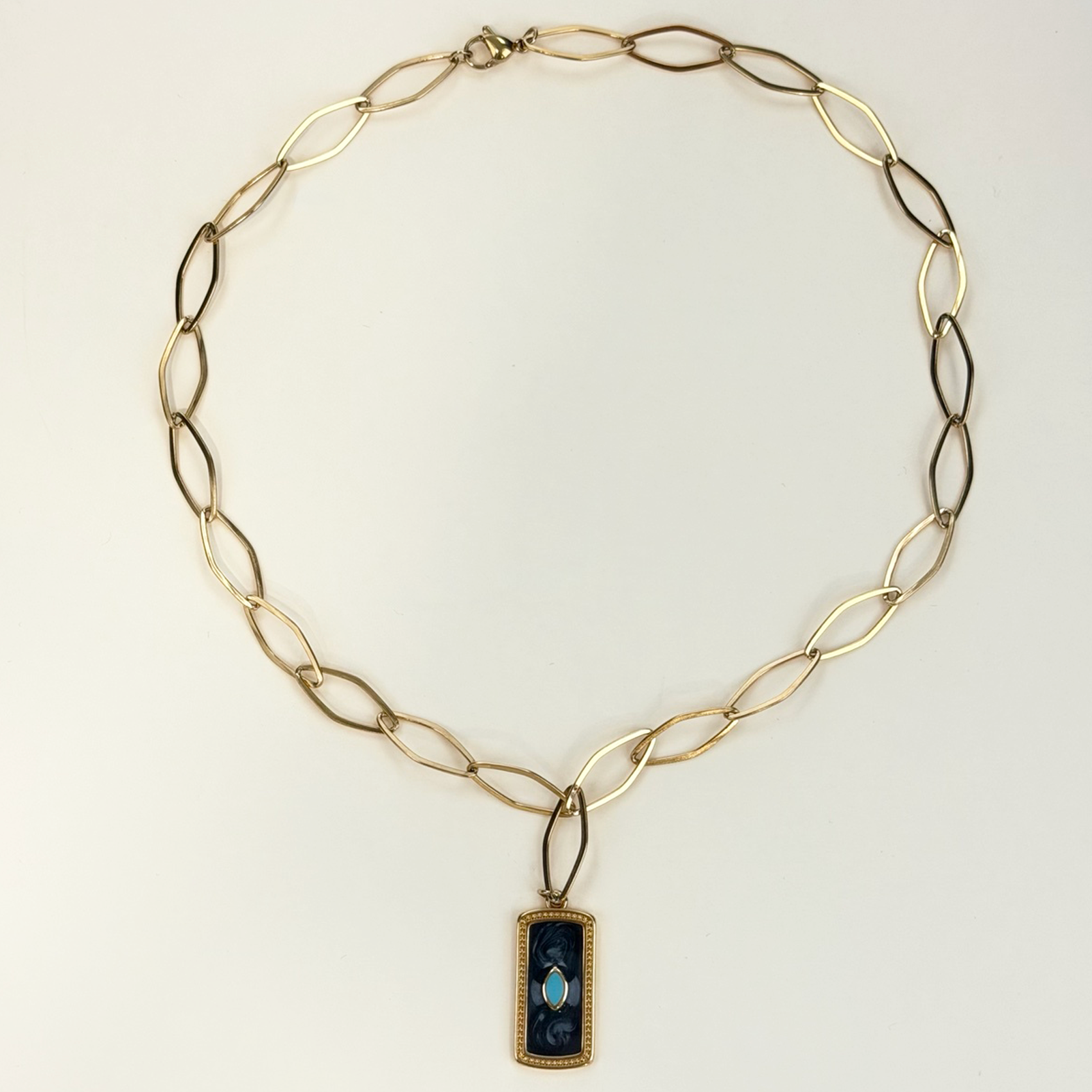 Ένα εντυπωσιακό κολιέ με χοντρή αλυσίδα σε χρυσό χρώμα και κλασικό πλέξιμο. Το κεντρικό του μενταγιόν είναι ένα τετράγωνο, ανάγλυφο στοιχείο με ακανόνιστο τελείωμα, που του δίνει μια vintage αισθητική.