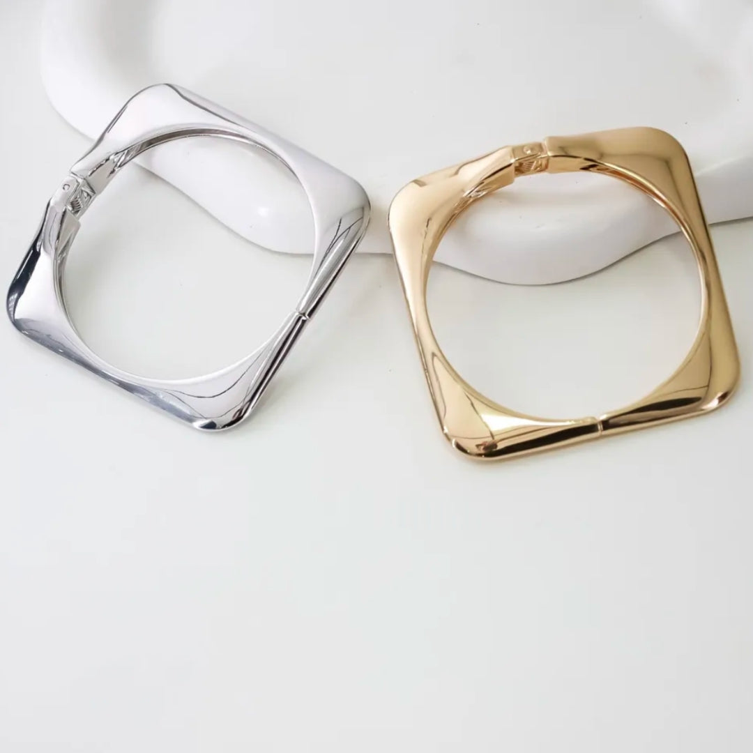 Μεταλλική χειροπέδα σε τετράγωνο σχήμα με στρογγυλεμένες γωνίες και χρυσό γυαλιστερό φινίρισμα. Διαθέτει σταθερό σκελετό με άνοιγμα στο πάνω μέρος που διευκολύνει την τοποθέτηση στον καρπό.