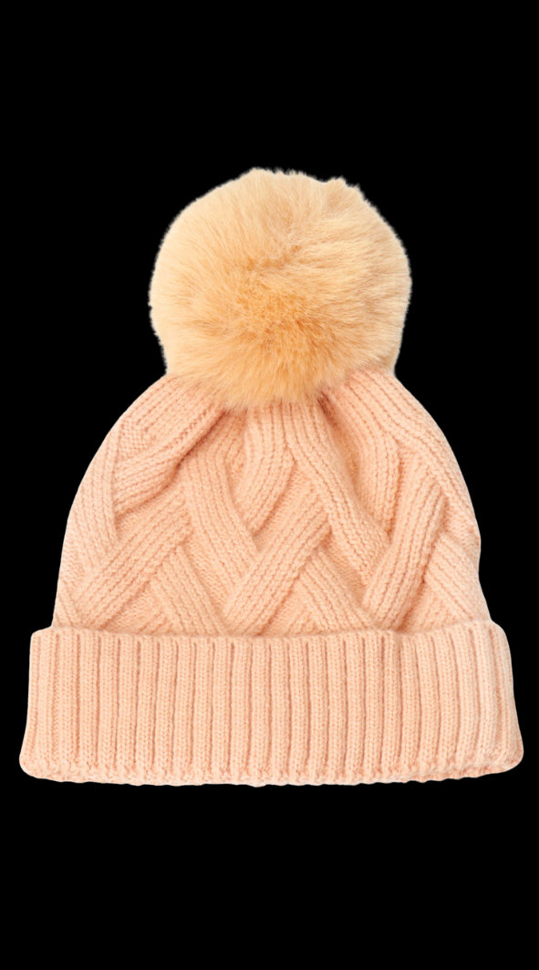 Ζεστό μπεζ σκουφάκι. Έχει πλεξούδες και αφράτη φούντα. Ιδανικό για χρώμα και ζεστασιά.